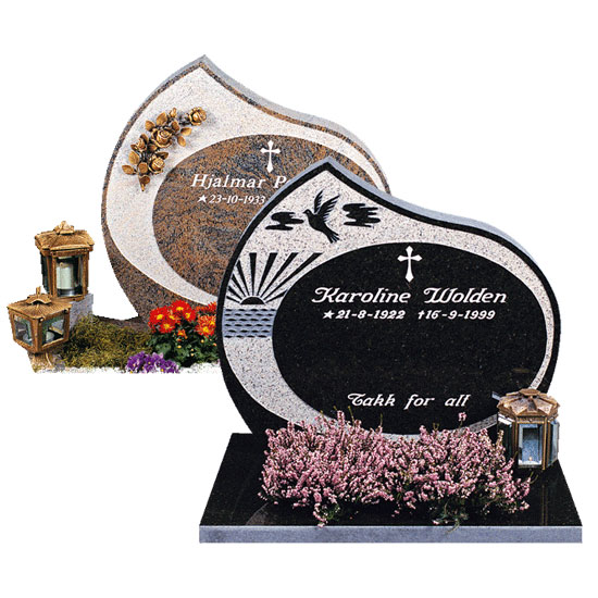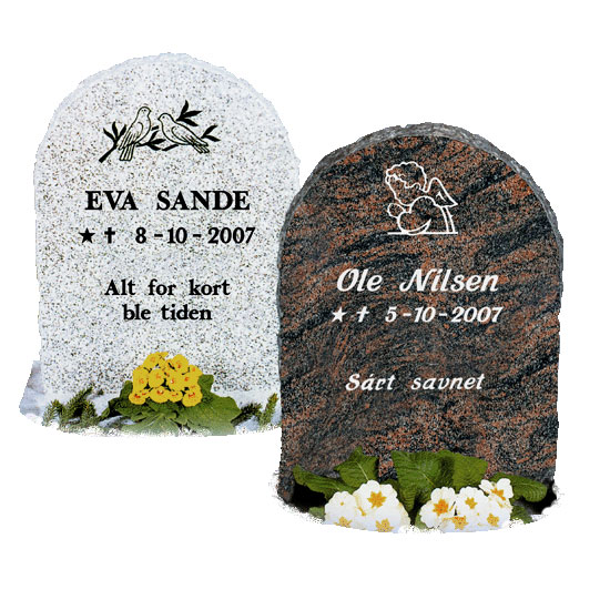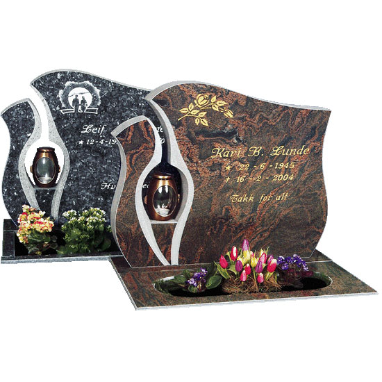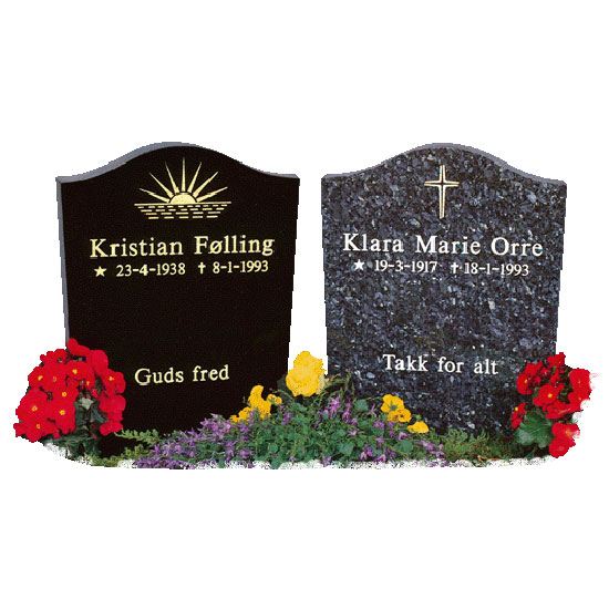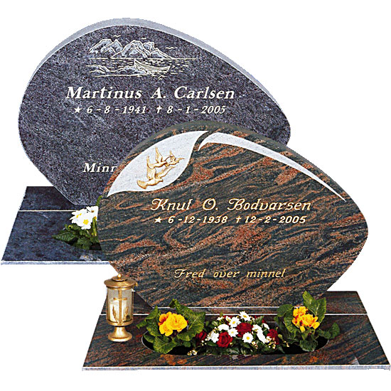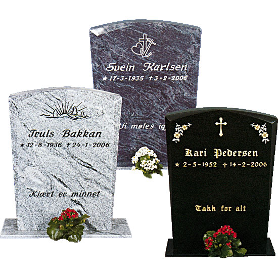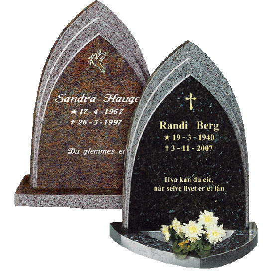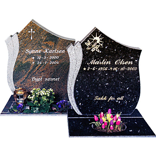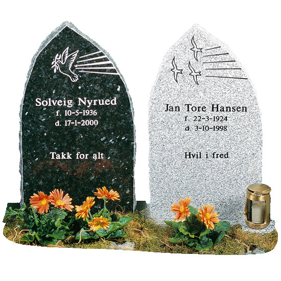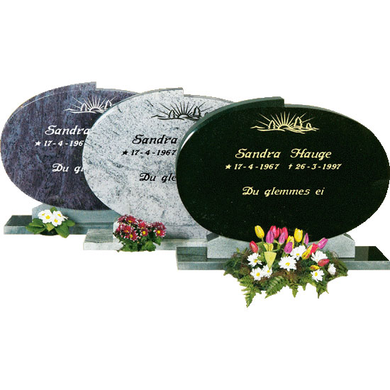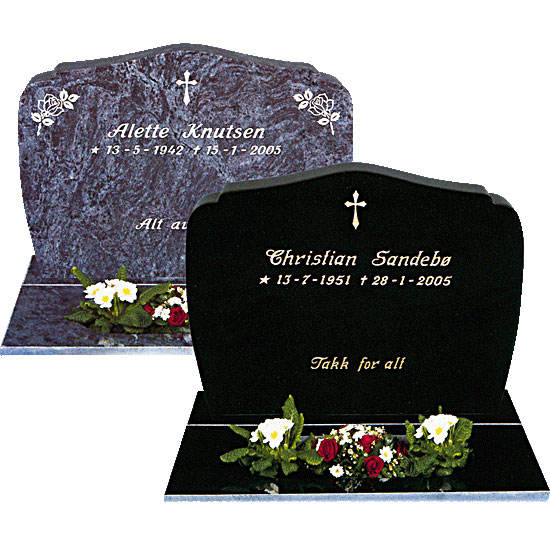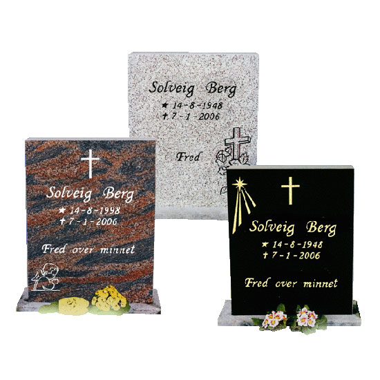 Under er et utvalg av de gravmonumentene vil kan tilby. Det er fullt mulig å endre steinsort og ornamenter hvis man ønsker det. Har man egne tanker om spesiell utforming er det også mulig å etterkomme.